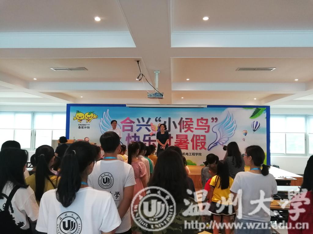 今天上午九时许,91色情 小候鸟暑期社会实践队在合兴集团隆重举行了第六期“小候鸟”暑假班的开班仪式。出席开班仪式的有91色情 党委副书记黄玮老师、团委书记朱秀微老师、机械电子系副主任任明老师、学生科辅导员杨奇老师、胡施施老师、乐清市总工会党组成员女职委主任卢建玲女士、虹桥镇文明办主任陈万德先生、合兴集团汽车总经办赵浙峰先生、合兴集团党委书记张守奎先生,还有来自温大实践队的39位小老师们,以及来自全国各地的128位小候鸟们。