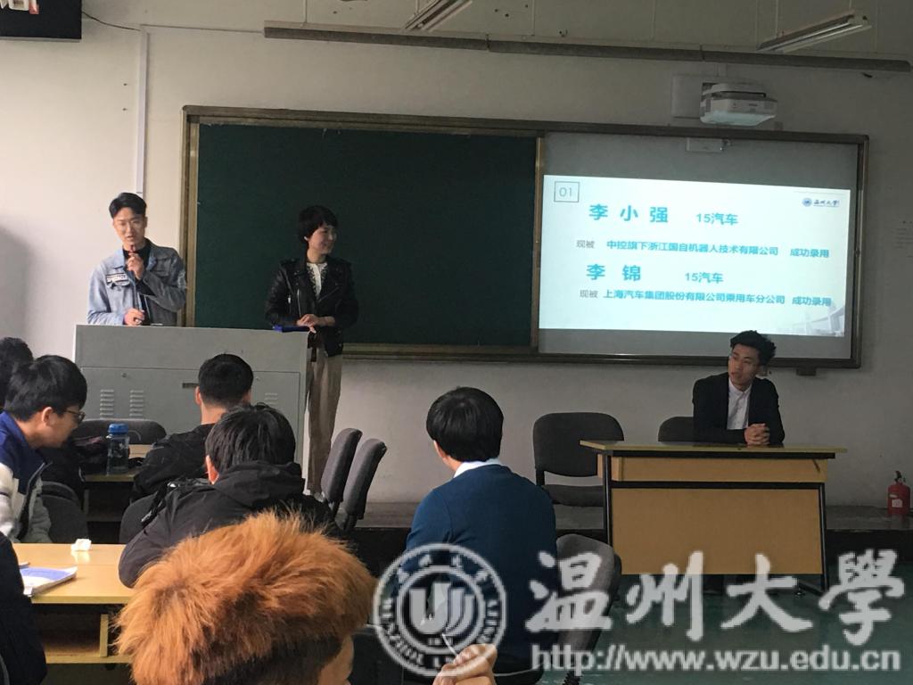 活动伊始,来自15卓工班的李小强,详尽地介绍了他到浙工大的校园招聘会求职经历。在这个招聘会上他总共投递了10份的简历,共计收到7家公司录用通知书,考虑到专业度的契合度最终选择了中控旗下的浙江国自机器人技术有限公司。李小强给16车辆班级全体讲述了他的求职经历与其中的规则,让学弟学妹们在求职的路上少走了许多弯路,并给了许多启迪。接着是15汽车李锦的分享,给他下面的直系学弟学妹们提供了许多新思路,并且提醒要勇于利用附近的资源去寻找求职路径,比如从外校得到更好的求职点来获得更好的平台。还分享了上汽的面试规则与其中的技巧,鼓励16车辆班级全体同学勇于去利用面试来提高自己。交流之余,同学们纷纷提问,学长们一一解答了同学们关于就业的诸多疑惑。