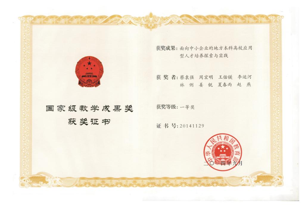 | 面向中小企业地方本科高校应用型人才培养探索与实践 | 20141129 | 一等奖 | 立足于地方本科高校的办学定位,面向区域产业升级和中小企业转型发展对应用型人才规格的新需求,在学校人才培养与区域产业升级双向互动中,回应中小企业转型发展对人才的新诉求,实施了分类分层的应用型人才培养模式,构建适应岗位需求的应用型人才课程教学体系和面向岗位素质要求的渐进式实践教育平体系,形成了多维联动、合作共赢的产学深度合作机制。 |